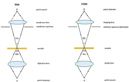 The optical reciprocity theorem, or principle of Helmholtz reciprocity, generally holds true for elastically scattered electrons, as is often the case under standard TEM operating conditions.[21][22] The theorem states that the wave amplitude at some point B as a result of electron point source A would be the same as the amplitude at A due to an equivalent point source placed at B.[22] Simply stated, the wave function for electrons focused through any series of optical components that includes only scalar (i.e. not magnetic) fields will be exactly equivalent if the electron source and observation point are reversed. R