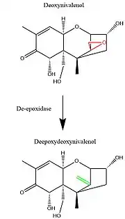 Outside of the strategies for physical and chemical decontamination, advancing research in molecular genetics has also given rise to the potential of a biological decontamination approach. Many microbes, including bacteria, yeast, and fungi, have evolved enzymatic gene products which facilitate the specific and efficient degradation of trichothecene mycotoxins.[68] Many of these enzymes specifically degrade the 12,13 carbon epoxide ring which is important for the toxicity of trichothecenes. For example, the Eubacteria strain BBSH 797 produces de-epoxidase enzymes which reduce the 12,13 carbon epoxide ring to a double bond group.[68] These, along with other microbes expressing trichothecene detoxifying properties, can be used in feed stores to prevent to toxic effect of contaminated feed upon consumption.[16] Furthermore, molecular cloning of the genes responsible for producing these detoxifying enzymes could be useful in producing strains of agricultural products that are resistant to trichothecene poisoning.[16]