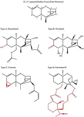 Trichothecenes are a group of over 150 chemically related mycotoxins.[3] Each trichothecene displays a core structure consisting of a single six-membered ring containing a single oxygen atom, flanked by two carbon rings.[4] This core ring structure contains an epoxide, or tricyclic ether, at the 12,13 carbon positions, as well as a double bond at the 9, 10 carbon positions.[5] These two functional groups are primarily responsible for trichothecene ability to inhibit protein synthesis and incur general cytotoxic effects.[6] Notably, this core structure is amphipathic, containing both polar and non polar parts.[7] All trichothecenes are related through this common structure, but each trichothecene also has a unique substitution pattern of oxygen containing functional groups at possible sites on carbons 3,4,7,8, and 15.[5] These functional groups govern the properties of an individual tricothecene and also serve as the basis for the most commonly used classification system for this family of toxins. This classification system breaks up the trichothecene family into four groups: Type A, B, C, and D.