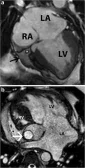 Tricuspid atresia -a) SSFP image indicates absent tricuspid valve replaced by fatty wedge tissue in right AV groove arrow b) tricuspid atresia in individual with dextro-transposition of great arteries this was treated with Fontan shunt arrow