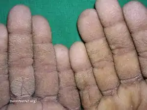 Tripe palms, also known as acanthosis palmaris, is a medical sign characterized by thick ridged velvety palms, typically as part of a paraneoplastic syndrome.[2] It resembles the lining of the stomach of some animals (tripe).[1] Other signs that may be noted at the same time include most frequently acanthosis nigricans (AN), and less commonly finger clubbing and Leser-Trélat sign.[1]