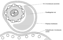 The microtubules of the flagellar axoneme lie in the normal 9+2 arrangement, orientated with the + at the anterior end and the − in the basal body. The cytoskeletal structure extends from the basal body to the kinetoplast. The flagellum is bound to the cytoskeleton of the main cell body by four specialised microtubules, which run parallel and in the same direction to the flagellar tubulin.[30][31]