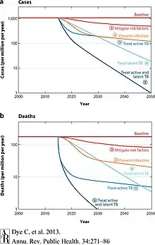 - 1 2 3 Dye, Christopher; Glaziou, Philippe; Floyd, Katherine; Raviglione, Mario (2013). "Prospects for Tuberculosis Elimination". Annual Review of Public Health. 34 (1): 271–286. doi:10.1146/annurev-publhealth-031912-114431. ISSN 0163-7525. PMID 23244049. S2CID 40664687.