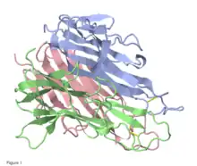 Trimeric structure of TNF alpha, produced by Mus musculus, based on PDB structure 2TNF (1.4 Å Resolution). Different colors represent different monomers. Baeyens, KJ et al. (1999).[1] Figure rendered using FirstGlance Jmol.