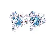 The tumor necrosis factor (TNF) superfamily is a protein superfamily of type II transmembrane proteins containing TNF homology domain and forming trimers. Members of this superfamily can be released from the cell membrane by extracellular proteolytic cleavage and function as a cytokine. These proteins are expressed predominantly by immune cells and they regulate diverse cell functions, including immune response and inflammation, but also proliferation, differentiation, apoptosis and embryogenesis.[2][3]