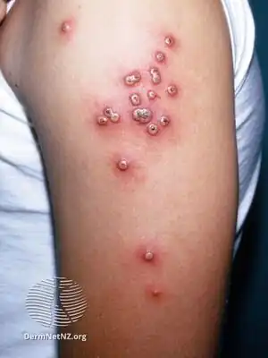 The disease may occur following vaccination with a live smallpox vaccine or contact with the virus itself.[1] The disease may also spread from the vaccination side via a person's hands.[1]