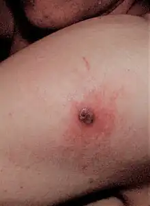 In March 2007, a 2-year-old Indiana boy and his mother contracted a life-threatening vaccinia infection from the boy's father.[20] The boy developed the telltale rash over 80 percent of his body after coming into close contact with his father, who was vaccinated for smallpox before being deployed overseas by the United States Army. The United States military resumed smallpox vaccinations in 2002. The child acquired the infection due to eczema, which is a known risk factor for vaccinia infection. The boy was treated with intravenous immunoglobulin, cidofovir, and Tecovirimat (ST-246), a (then) experimental drug developed by SIGA Technologies.[21] On April 19, 2007, he was sent home with no after effects except for possible scarring of the skin.[20]