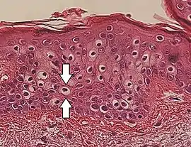 It is one of the components of koilocytosis, which may be present in potentially pre-cancerous cervical, oral and anal lesions.[2]