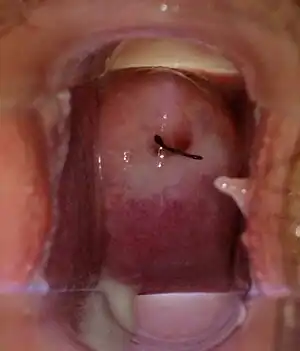 | Normal vagina and cervix during a medical speculum exam demonstrating IUD strings at the opening of the cervix and normal milky white vaginal discharge on the vaginal walls, cervix, and pooled in vaginal fornix. | |