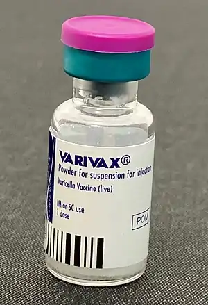 - ↑ "Varivax powder and solvent for suspension for injection - Summary of Product Characteristics (SmPC)". (emc). 29 November 2018. Archived from the original on 29 December 2019. Retrieved 28 December 2019.