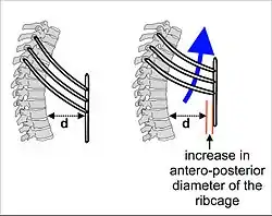The effect of the muscles of inhalation in expanding the rib cage. The particular action illustrated here is called the pump handle movement of the rib cage.