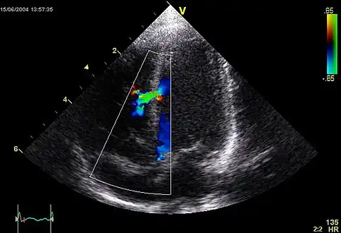 Ventricular septal defect (VSD) is a birth defect of the heart in which there is a hole in the wall between the ventricles, the lower two chambers of the heart.[1] Symptoms in babies may vary from none to shortness of breath, poor feeding, and excessive sweating.[2] Complications may include pulmonary hypertension, arrhythmias, endocarditis, or heart failure.[2]