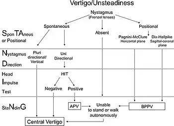 A four step approach for separating peripheral from central causes of vertigo, known as the STANDING protocol, has been proposed.[33][1] The first step is to determine if nystagmus only occurs with movement, is continuously present, or is absent.[33] If nystagmus only occurs with movement the cause is likely BPPV.[33] If nystagmus is continuously present and it occurs in multiple directions or is vertical the cause is central.[33] If it is continuously present in one direction, the HINTS (HIT) test should be performed, and if positive it is likely an acute peripheral vestibular disease.[33] Finally it should be verified that the person can stand and walk independently, which if they cannot the cause is central.[34][33]