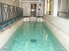The first Victorian Turkish bath in Paris opened to the public in March 1876 on the junction of the Rue Neuve des Mathurins and the Rue Auber.[68] The majority of its patrons were men, but certain specific times were set aside for women, who entered through a discreet entrance at 47 Boulevard Haussmann, round the corner.[69] Though called the Paris Hammam, Nebahat Avcıoğlu has convincingly argued that not only was it influenced by baths in Britain, but especially by Urquhart's Jermyn Street baths, opened fourteen years earlier.[70] Designed in a lavish style by architects William Klein and Albert Duclos, the baths included a swimming pool, restaurant and a hairdresser.[69] That shampooing was undertaken by two Englishmen trained at the Jermyn Street baths[71] reinforced the idea that the baths were designed to attract members of the local and international high society. In this it succeeded, its regular bathers including Léon Gambetta, Georges-Eugène Haussmann, the Prince of Wales, the Baron de Rothschild,[69] and many of those famous in the world of the arts. It remained open until 1954 before being converted into offices. Today only the façade remains, with its numerous westernised horseshoe windows, arches, and grilles.