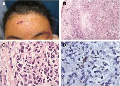 - 1 2 3 Ganguly S, Mukhopadhyay D, Das N, et al. (2010). "Enhanced Lesional FoxP3 Expression and Peripheral Anergic Lymphocytes Indicate a Role for Regulatory T Cells in Indian Post-Kala-azar Dermal Leishmaniasis". J. Invest. Dermatol. 130 (4): 1013–22. doi:10.1038/jid.2009.393. PMID 20032994.