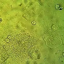 A vaginal wet mount with a clue cell at bottom left, indicating bacterial vaginosis.