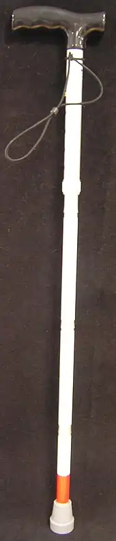 A white cane is a device used by many people who are blind or visually impaired. A white cane primarily allows its user to scan their surroundings for obstacles or orientation marks, but is also helpful for onlookers in identifying the user as blind or visually impaired and taking appropriate care. The latter is the reason for the cane's white colour, which in many jurisdictions is mandatory.