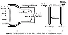 The overall function of an image intensifier is to convert incident x-ray photons to light photons of sufficient intensity to provide a viewable image. This occurs in several stages. The input window is convex is shape, made up of aluminium to minimise the scattering of X-rays. The window is 1 mm in thickness. Once X-rays pass through the aluminium windows, it encounters input phosphor that converts X-rays into light photons. The thickness of input phosphor range from 300 to 450 micrometres reach a compromise between absorption efficiency of X-rays and spatial resolution. Thicker input phosphor has higher absorption efficiency but poor spatial resoution and vice versa. Sodium activated Caesium Iodide is typically used due to its higher conversion efficiency thanks to high atomic number and mass attenuation coefficient, when compared to zinc-cadmium sulfide. The input phosphor are arranged into small tubes, to allow photons to pass through the tube, without scattering, this improving the spatial resolution.[2] The light photons are then converted to electrons by a photocathode. The photocathode is made up of antimony caesium, which is to match the photons produced from input phosphor, thus maximise the efficiency of producing photoelectrons. The photocathode has a thickness of 20 nm with absorption efficacy of 10 to 15%.[2]