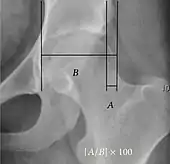- Reimer's migration index (MI), also called the femoral extrusion index,[3] is calculated if hip dysplasia is detected. It can be used to indicate hip dislocation. It is the horizontal distance (parallel to the Hilgenreiner Line) between the Perkin line and the lateral border of the ossification center of the femoral head, divided by the horizontal width of the ossification center. The migration index is normally less than 33% by most sources,[9] but 25% and 30% has also been suggested.[10]