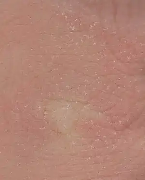 Symptoms most associated with xeroderma are scaling (the visible peeling of the outer skin layer), itching, and skin cracking.[4] Xeroderma occurs most commonly on the scalp, lower legs, arms, hands, the knuckles, the sides of the abdomen, and thighs. [4]