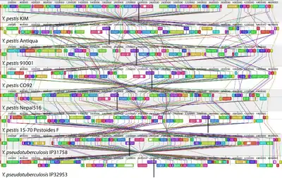 - ↑ Chain PS, Hu P, Malfatti SA, Radnedge L, Larimer F, Vergez LM, et al. (June 2006). "Complete genome sequence of Yersinia pestis strains Antiqua and Nepal516: evidence of gene reduction in an emerging pathogen". Journal of Bacteriology. 188 (12): 4453–63. doi:10.1128/JB.00124-06. PMC 1482938. PMID 16740952.