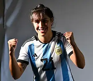 Before focusing on football, Lonigro worked in a cleaning company among other occupations.[5] Besides Argentina, Lonigro has played in Paraguay.[6] During the 2019/20 season, she made sixteen appearances and scored seventeen goals before the season was halted due to the Coronavirus pandemic.[4]