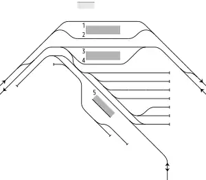 Ōe Station has two island platforms and one side platform, serving a total of five tracks.