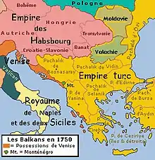 At this time, the Prince-Bishopric of Montenegro, though independent, was more or less subjected to the Ottoman Empire. Since the Ottomans had a relatively weak central government, the Montenegrins occasionally fought against them.[6] As a small mountain realm, Montenegro remained one of the few more or less independent Orthodox Christian areas in the Balkans, and the Ottomans remained a constant threat to their continued existence.[7] On the Adriatic coast, Montenegro was also bordered by the Republic of Venice, which was slowly losing its grasp over the region. Montenegro's predicament was compounded by frequent infighting and the lack of authority enjoyed by the ruling Prince-Bishop, Sava.[6] The Montenegrins had little respect for Sava, who was an idle ruler. Though he had once co-ruled with his more respected and competent cousin, Vasilije, the latter died on 10 March 1766, leaving the country more or less leaderless.[8] There was no real state in Montenegro at the time, with the country rather being more akin to a conglomerate of autonomous and semi-nomadic clans precariously united because of external danger.[7] Šćepan Mali's subsequent success partly built on the widespread Montenegrin belief and hope for a saviour figure.[1]