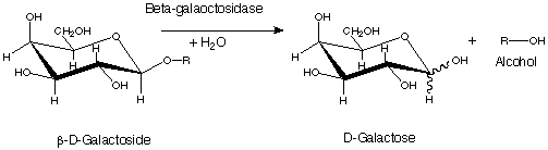 β-Galactosidase is an exoglycosidase which hydrolyzes the β-glycosidic bond formed between a galactose and its organic moiety. It may also cleave fucosides and arabinosides but with much lower efficiency. It is an essential enzyme in the human body. Deficiencies in the protein can result in galactosialidosis or Morquio B syndrome. In E. coli, the lacZ gene is the structural gene for β-galactosidase; which is present as part of the inducible system lac operon which is activated in the presence of lactose when glucose level is low. β-Galactosidase synthesis stops when glucose levels are sufficient.[2]