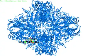 - 1 2 3 Rojas AL, Nagem RA, Neustroev KN, Arand M, Adamska M, Eneyskaya EV, et al. (November 2004). "Crystal structures of β-galactosidase from Penicillium sp. and its complex with galactose". Journal of Molecular Biology. 343 (5): 1281–92. doi:10.1016/j.jmb.2004.09.012. PMID 15491613.