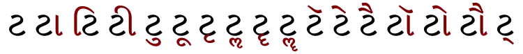 | ट | टा | टि | टी | टु | टू | टृ | टॄ | टॢ | टॣ | टे | टै | टो | टौ | ट् |