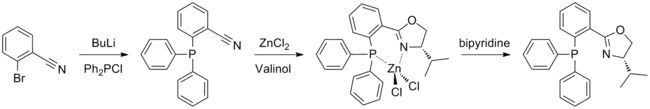 (S)-iPr-PHOX is prepared using the amino alcohol valinol, which is derived from valine. The phosphine moiety may be introduced first, by a reaction between 2-bromobenzonitrile and chlorodiphenylphosphine; the oxazoline ring is then formed in a Witte Seeliger reaction. This yields an air stable zinc complex which must be treated with bipyridine in order to obtain the free ligand. Synthesis is performed under argon or nitrogen to avoid contact with air, however the final product is not air sensitive.