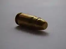 Oblique view of a .357 SIG FMJ cartridge.