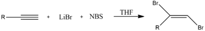 Alternately, halogenation of this kind could also be achieved through the use of two equivalents of N-bromosuccinimide and lithium bromide (LiBr). N-Bromosuccinimide provides Br+ as an electrophile, which is followed by Br− from LiBr.[2]