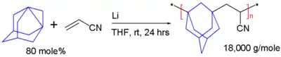 In this scheme, 1,3-dehydroadamantane is reacted with acrylonitrile in a radical polymerization initiated with lithium metal in tetrahydrofuran. The resulting alternating copolymer has a glass transition temperature of 217 °C[2]