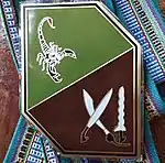 The official seal of the Division is an irregular hexagon divided in half with a scorpion (Filipino: Alakdan) over a green field on top-left and two crossed bolos and a kris, made to look like the Roman Numeral of eleven, over a brown field on the lower-right.