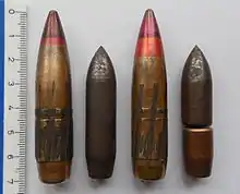 - BS: Armour-piercing incendiary original anti-tank round. The projectile weighs 64.4 g (2.27 oz) and is 51 mm (2.0 in) long with a 38.7 g (1.37 oz) core of tungsten carbide[1] with 1.8 g (0.063 oz) of incendiary material in the tip. The overall round weighs approximately 200 g (7.1 oz) and is 155 mm (6.1 in) long. The projectile has a muzzle velocity of approximately 1,006 m/s (3,300 ft/s) and can penetrate 30–32 mm (1.2–1.3 in) of RHA steel at an incidence of 0 degrees at a range of 500 m (1,600 ft), or 40 mm (1.6 in) at a range of 100 m (330 ft).[2][3][4]