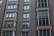 The twelve upper stories are similar in design to each other and contain several types of windows.[14] The windows in the outermost wide bays, and on the third through tenth stories of the center bay, project slightly from the facade and contain trapezoidal frames. The outermost bays contain double-height windows.[14] These double-height windows were designed to maximize sun exposure.[9] The windows in the narrow bays, and in the eleventh through fourteenth stories of the center bay, do not project. In all bays, there are geometric white-painted spandrels between the windows on each story, and the windows have white mullions.[14] The original design contained a metal cornice above the fourteenth story, matching that of 130 West 57th Street, but the cornice was removed sometime in the 20th century.[13]