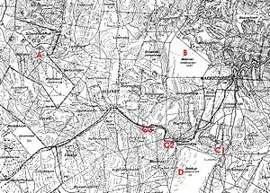 Gun C. Initially this gun was mounted on a railway truck. Around 7 August it was moved to the Elandskop vicinity.[13] This emplacement, marked "C1", is situated at 25°46'13"S, 30°12'50"E (WGS84). Before 23 August the gun was moved to a place south-west of Dalmanutha station ("C2")situated at 25°46'14"S, 30°09'05"E [WGS84].[14] Thereafter it was moved to hill 1881 behind the ZARPs (C3) at 25°44'10"S, 30°07'00"E (WGS84) .[13] After the battle it fled past Helvetia to Lydenburg and from there over the pass to Spitskop, Ohrigstad and eventually to Haenertsburg.[1]: pp.119–128