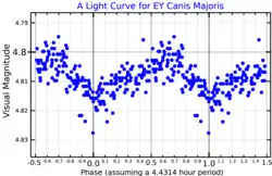 15 Canis Majoris is a variable star in the southern constellation of Canis Major,[8] located roughly 1,200 light years away from the Sun.[2] It has the variable star designation EY Canis Majoris; 15 Canis Majoris is the Flamsteed designation. The star is visible to the naked eye as a faint, blue-white hued star with a baseline apparent visual magnitude of +4.82.[3] It is moving away from the Earth with a heliocentric radial velocity of 28 km/s.[7]