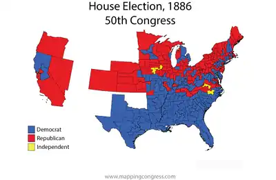 The 1886 United States elections occurred in the middle of Democratic President Grover Cleveland's term, during the Third Party System. Members of the 50th United States Congress were chosen in this election. Democrats retained control of the House, while Republicans retained control of the Senate.