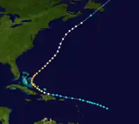 Historical weather maps indicate the presence of a tropical storm about 535 mi (860 km) east-northeast of Barbados on September 7.[1][5] Moving west-northwestward, the storm passed just north of the Lesser Antilles and slowly intensified, becoming a hurricane just offshore the Dominican Republic early on September 11. Thereafter, the cyclone strengthened more quickly, becoming a Category 2 hurricane just prior to striking Inagua in the Bahamas several hours later with winds of 100 mph (160 km/h). Around 12:00 UTC on September 12, the system strengthened into a Category 3 hurricane and peaked with maximum sustained winds of 120 mph (190 km/h) by early the following day. The storm curved northward and passed over or near several islands on September 13 and September 14, including Exuma, Cat Island, and Eleuthera. Later on September 14, the cyclone turned northeastward and exited the island chain. While traversing the open Atlantic, the system slowly weakened and remained a hurricane until falling to tropical storm intensity late on September 18 while just offshore Newfoundland. The storm soon struck the island and became extratropical near Port Rexton. The extratropical remnants continued northeastward and dissipated over the Labrador Sea late the following day.[1]