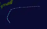 Typhoon Marie had a minimum pressure of 956 mb and a maximum windspeeds of 85 mph. Marie crossed the southern islands of Kyūshū and Shikoku before turning northeast and striking Hokkaidō island. Marie caused the ship Toya Maru to sink in the Tsugaru Strait. 1,361 people were killed and 400 were left missing.[4] Due to this disaster, the typhoon is known in Japan as the Toya Maru Typhoon.[5]