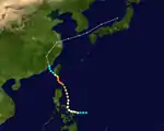 A tropical depression developed southwest of Guam on July 25. It moved north-northeastward, passing east of the Northern Marianas. On July 27, it intensified into a tropical storm and was designated Wanda. On the same day, the storm turned more westward, steered by the subtropical ridge to the north. Low wind shear and warm waters allowed Wanda to intensify steadily, developing into an intense typhoon. On July 30, reconnaissance aircraft recorded a minimum pressure of 902 mbar (26.6 inHg), and the peak winds were estimated at 295 km/h (183 mph). After passing through the Miyako Islands, Wanda weakened slightly and traversed the East China Sea. On August 1, the typhoon made landfall in eastern China near Zhoushan, Zhejiang, producing a pressure of 923 mbar (27.3 inHg); this was the lowest pressure recorded in China from a tropical cyclone. Wanda slowly weakened while progressing through China, dissipating on August 5.[1][2]