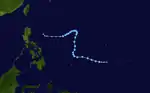 Typhoon Gloria developed on September 5, over the open waters of the West Pacific. The storm rapidly intensified to a peak of 155 mph on September 9. It weakened as it continued west-northwestward, and made landfall on extreme northeastern Taiwan on September 11, as a 100 mph typhoon.[22] The typhoon caused severe flooding in Northern Taiwan and killed hundreds of people.[23] Gloria continued westward, and hit eastern China that night as an 85 mph typhoon. The storm looped over land to the northeast, and dissipated on September 13, to the east of China. Gloria killed 239 people, and left 89 missing.[23]