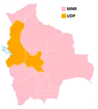 Although the Democratic and Popular Union received the most votes in the Congressional elections, the Revolutionary Nationalist Movement-Alliance (MNR–A) won the most seats, largely as a result of the electoral system giving more seats to sparsely populated rural areas where the MNR–A was more popular.[3]