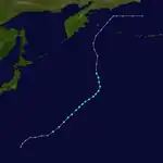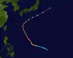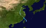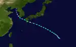 An area of convection active for the previous 48 hours led to the formation of a low level circulation near 23°N 151°E / 23°N 151°E early on July 27. Gradual intensification ensued, and the system developed into a tropical depression that evening, a tropical storm on July 28, and a typhoon by July 31 as it moved west-northwest. The cyclone struck southern Kyūshū, in Japan, early on July 31 which weakened the cyclone. The tropical storm then moved into the East China Sea which continuing to spin down. Upper-level wind shear took its toll, leading to its weakening into a tropical depression and its ultimate dissipation in the Yellow Sea along the west coast of Korea.[3]