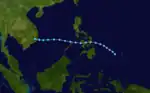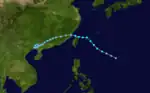 A tropical disturbance organized into a tropical depression east of the Philippines on June 28. It tracked westward, reaching tropical storm on June 30 before hitting the central Philippines. Kelly weakened over the islands, but restrengthened in the South China Sea, attaining typhoon status on July 2. The typhoon hit southern Hainan Island on July 3, bringing wind gusts to 54 knots (100 km/h) at Tate's Cairn in Hong Kong.[2] The cyclone then crossed the Gulf of Tonkin as a weakening tropical storm, and made landfall on northern Vietnam on July 4 as a tropical storm with maximum sustained winds of 35 knots (65 km/h). Kelly dissipated the next day, after causing torrential flooding and mudslides, resulting in 200 casualties and leaving thousands homeless.[3]