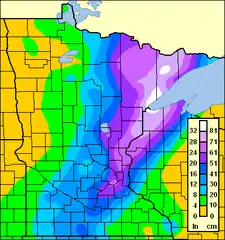 | Maximum snowfall or ice accretion | 38.2 inches (96 cm) (Duluth, MN) |
