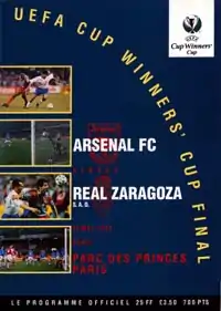 The 1995 UEFA Cup Winners' Cup Final was a football match on 10 May 1995 contested between cup holders Arsenal of England and Zaragoza of Spain. The final was held at Parc des Princes in Paris. It was the final match of the 1994–95 UEFA Cup Winners' Cup, 35th UEFA Cup Winners' Cup final, and the first since the tournament changed name from the European Cup Winners' Cup. Zaragoza won the match 2–1 after extra time, preventing Arsenal from retaining the trophy that they had won in 1994.